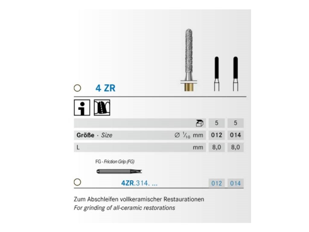 Komet 4ZR je válec s kulatým koncem, hrubozrnný diamant, používaný pro řezání celokeramických korunek. 4ZR lze použít na všechny celokeramické korunky, včetně: Oxid zirkoničitý, Disilikát lithia.